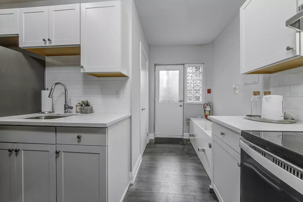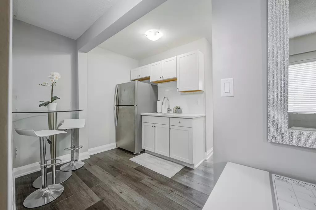 - Sleek and modern eat-in kitchen with stainless steel appliances